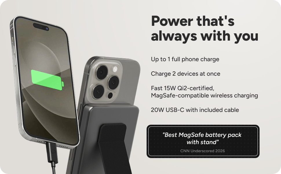 Qi2-certified 15W power bank with stand containing a 5,000mAh internal battery